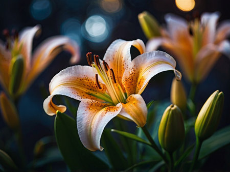 Two lily flowers are displayed against a dark background, showcasing their delicate petals. The flowers exhibit a combination of orange, white, and red hues, with intricate patterns. The lighting creates highlights and shadows, emphasizing texture. This image is suitable for various commercial uses, including decorative purposes and editorial content.