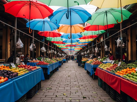 A lively market scene with vibrant umbrellas and fresh produce on display