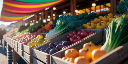 Colorful displays of fresh vegetables and fruits fill the stalls at a lively farmers' market, creating a cheerful atmosphere under the sun.