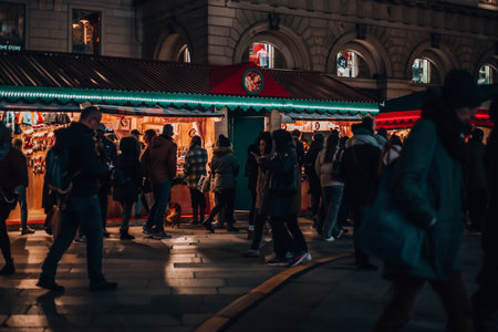 Crowds move through a vibrant holiday market adorned with twinkling lights, showcasing booths filled with festive goods and decorations.