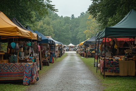 Colorful tents and tables filling a park alley during a rainy summer day at a local market