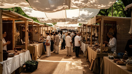 A bustling outdoor market with wooden stalls shaded by white fabric canopies. People browse handmade goods and crafts in a sun-dappled, rustic setting, evoking a warm and traditional atmosphere.