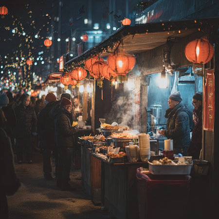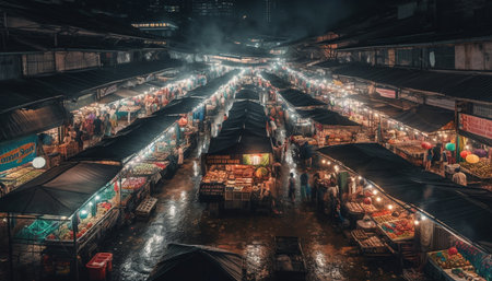 People vibrant browsing night market stalls, enjoying the warm glow of lights while purchasing fresh groceries and street food
