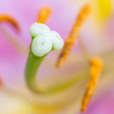 Macro closeup of the stamens and pistil of a fresh white tiger lily flower, retro effect faded look.