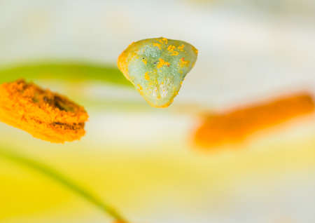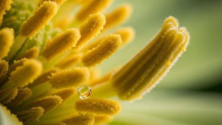 Macro view of yellow flower stamens with pollen and a tiny water droplet reflecting light, soft green background.