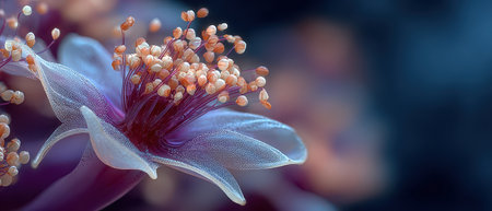 Water drops on a flower. Bright white droplets on the delicate petals. Stamens and pistils photographed with high magnification. The invisible world of plants and flowers.