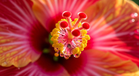Extreme close-up of a blooming flower, showcasing intricate details of its yellow stem, red-striped petals, and yellow stamen with tiny water droplets.
