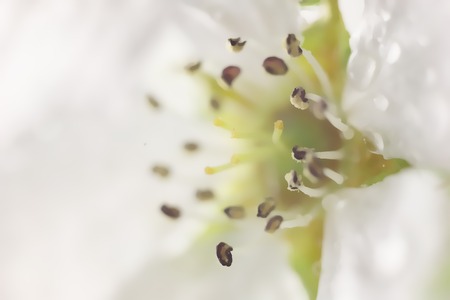 Extreme close up image of white apple blossom, yellow stamen in center of it. Selective focus and shallow depth of field.
