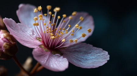 Stunning macro image of a delicate pink flower showcasing detailed petals and vibrant yellow stamens against a dark background.