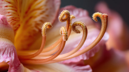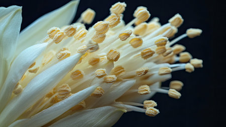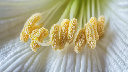 Delicate yellow stamen showcase vibrant pollen grains, inviting pollinators to explore the intricate beauty of nature\'s design.