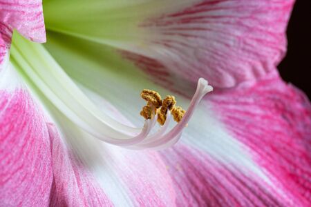 Beautiful pink hippeastrum flower close-up. Closeup of inflorescences with stamens and pestle.
