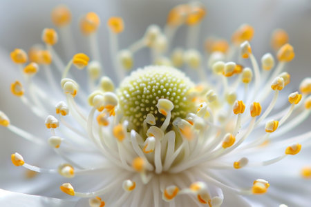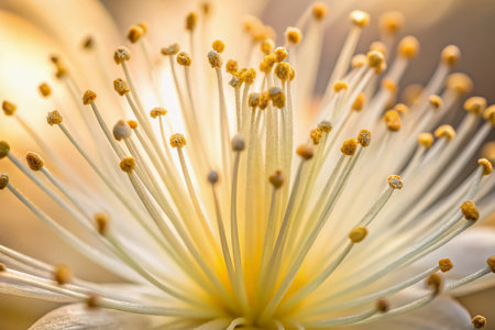 Delicate flower stamen and filaments stand out against a soft, creamy background, with fine pollen dusting adding subtle texture to this beautifully intricate macro shot.