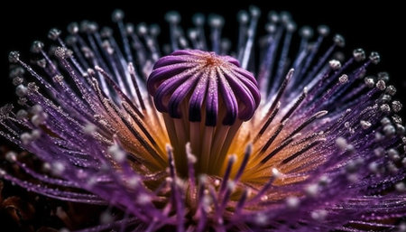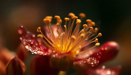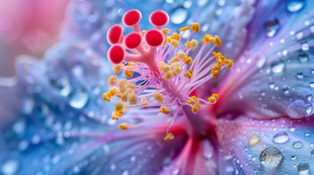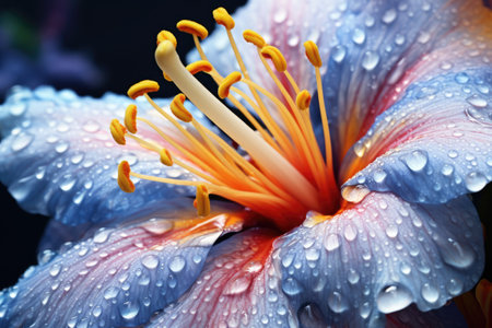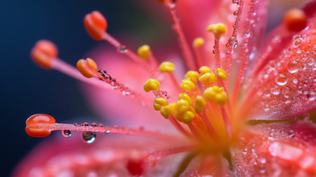 A stunning close-up of a flower with dew drops, showing intricate details and vibrant colors. Macro photography captures the beauty of nature.