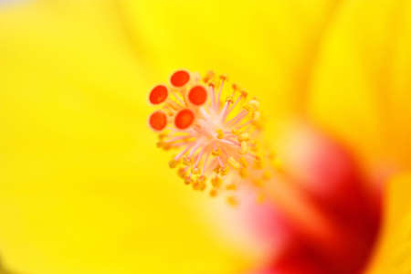 Hibiscus flower with pollen on blue background. Shallow depth of field