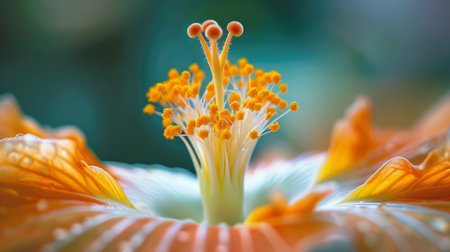 A macro shot captures the intricate details of an exotic orange flower's stamens against a dark teal backdrop, highlighting its delicate structure and vibrant colors.