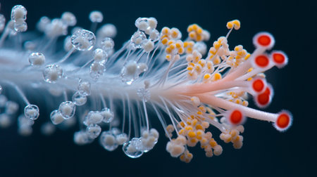 A delicate flower showcases vibrant petals and numerous pollen structures adorned with glistening dew drops in a soft background.