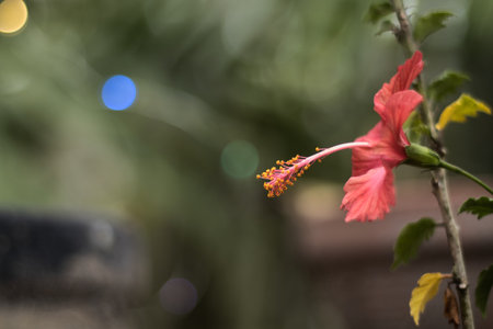 Romantic colorful beautiful hibiscus flower in nature, flower leaf and hibiscus flower in garden. Exotic love tropical island nature garden, blooming hibiscus flower in blurred gre