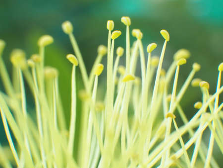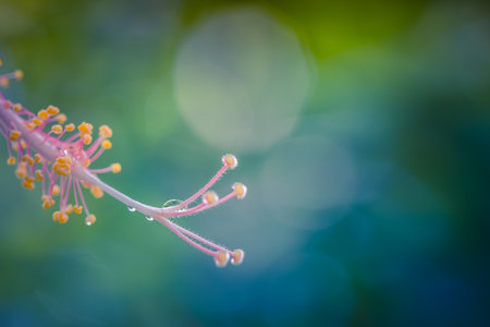 Macro shot of Hibiscus flower pollens with defocused green background and copy space