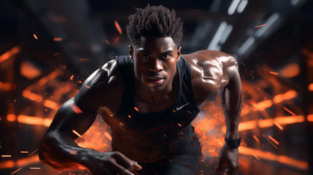 Portrait of african american male athlete running with fire on background.
