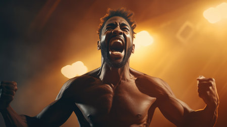 Athletic man celebrating on stage with spotlights