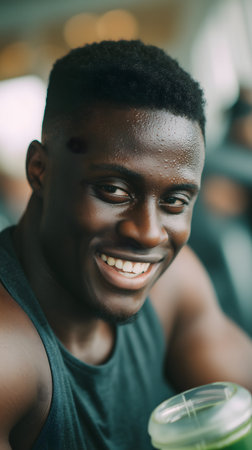 Young african american man in sportswear smiling and looking at camera while holding a glass of green smoothie