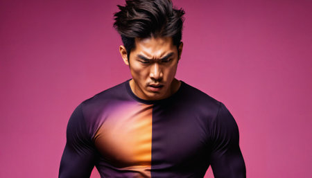 photo of asian man as a mafia gang member standing against pink background, generative AI