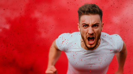 A focused male runner appears in motion, shouting with intensity. The red background adds drama, creating an explosive atmosphere. The image conveys energy and determination.