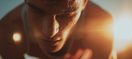 Close-up image of a male runner intensely preparing for a race, with sunlight highlighting his focused expression. The cinematic composition captures the energy and determination.