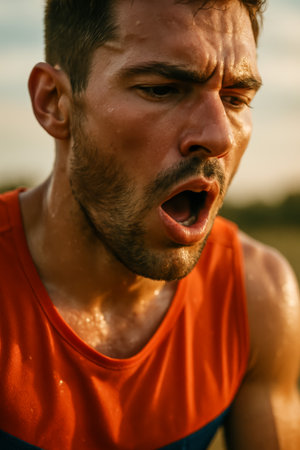 A young man, visibly sweating, expresses intense effort and focus during outdoor exercise