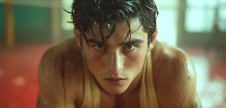 Passionate male athlete showing raw energy and determination during intense workout in gym with dramatic lighting and powerful expression of strength