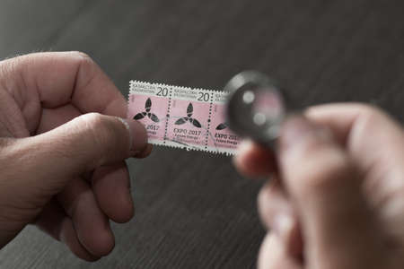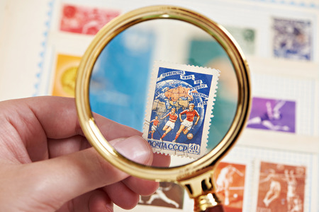Dolgoprudny, Moscow region, Russia. 02-24-2020. Male hands hold a magnifying glass through which enlarged images of different postage stamps with stamps are visible.