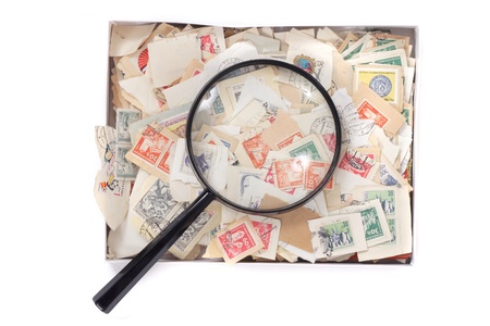 Flat lay of some old stamps from different countries of the world next to a magnifying glass for a philately fan