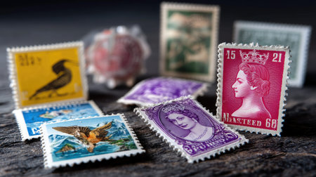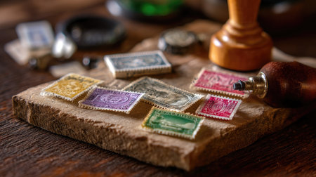 A beautifully arranged collection of vintage stamps on a rustic wooden table, highlighting the intricate details and colors of each stamp.