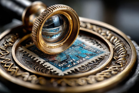 A vintage postage stamp is examined closely with a magnifying glass, revealing its intricate design and colors.