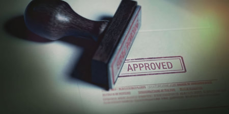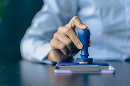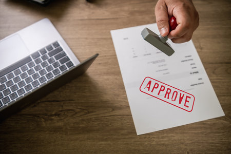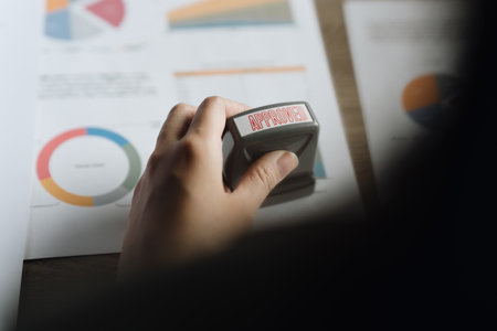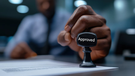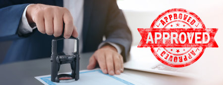 Close-up of a hand stamping Approved on legal paperwork in a clean office Concept, Business