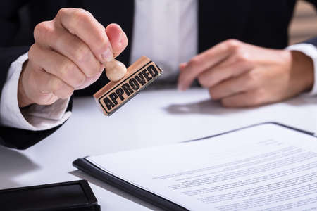 approved stamp. Close-up Of Person Hand Stamping With Approved Stamp On Document At Desk. businessman appoval stamper stamp on paper business contract