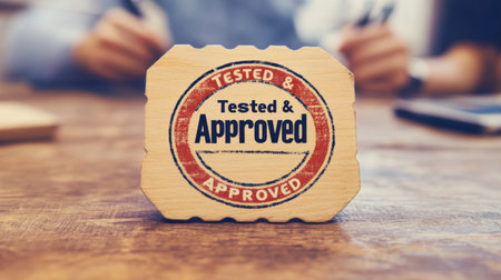 A vintage wooden stamp displaying the words Tested & Approved rests on a desk, symbolizing quality assurance and trust in a professional office environment.