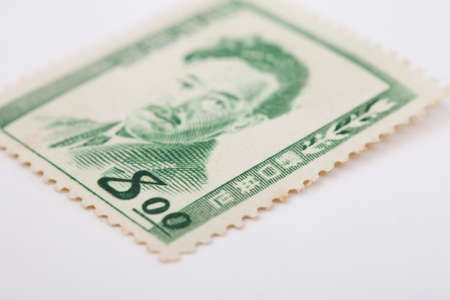 An extreme macro photograph capturing a curated collection of antique postage stamps featuring influ
