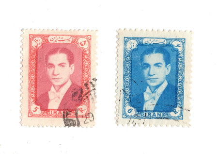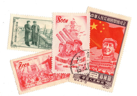 Low angle macro of clustered vintage red and magenta postage stamps with dramatic sunlight and shado
