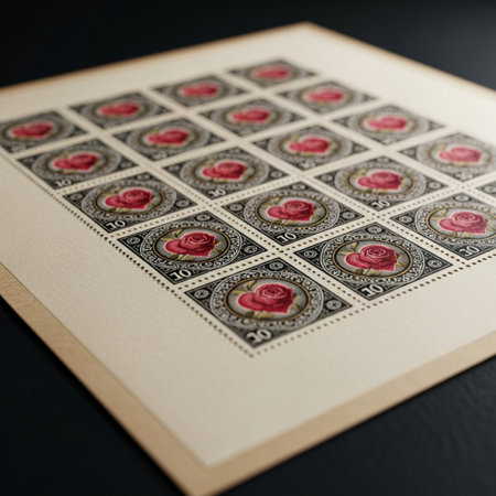 A dramatic, Dutch-angled close-up of a haphazard pile of colorful, aged Valentine's Day postage stam