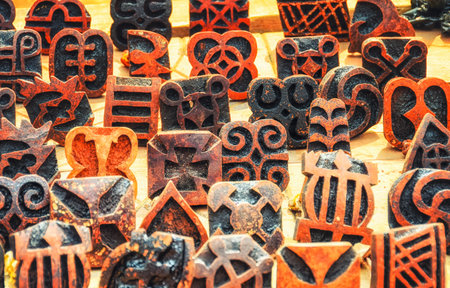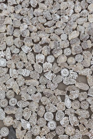 Vintage handmade wooden stamps for fabric decoration at open market in India, Rajasthan