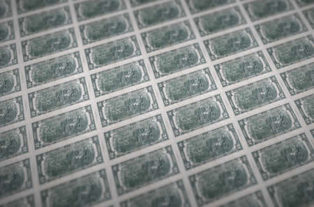 2 US dollars bills printed in illegal money production conveyor. Collage of many fake bills. Concept of counterfeitters mass work