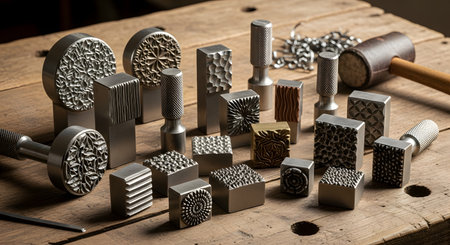 A collection of various metal stamps with intricate patterns for leatherworking or metal stamping, arranged on a rustic wooden workbench. A mallet is visible in the background, suggesting a craftsman's workshop. These tools are used for creating decorative impressions and textures.