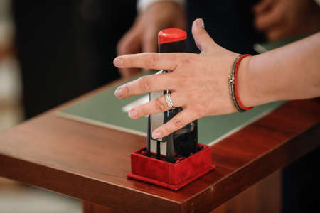 Woman's hand with the seal, stamp. Process stamping the contract, documents, close up.