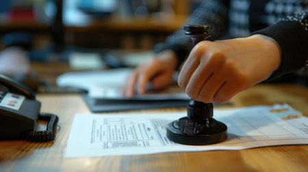 Close-up of a persons hand stamping with approved stamp on certificate document public paper.