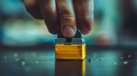 A lawyer or notary puts a seal on the document. A stamp in a mans hand.