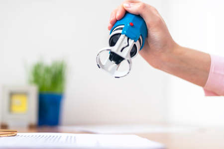 close up woman hand hold blue stamp while signing and stamping contract, make investment, taking insurance, writing will testament, hand with stamp close up