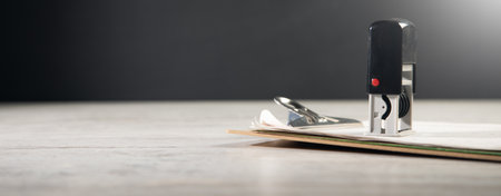 A traditional rubber ink stamp placed on a paper. Man stamps documents by plastic, rubber stamp, on a wooden, office desk. Man at work in office, at a desk.