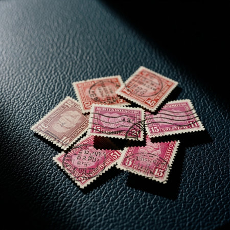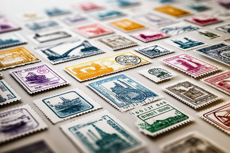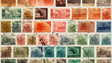 Close-up view of various old postage stamps, highlighting their intricate designs, vibrant colors, and historical significance