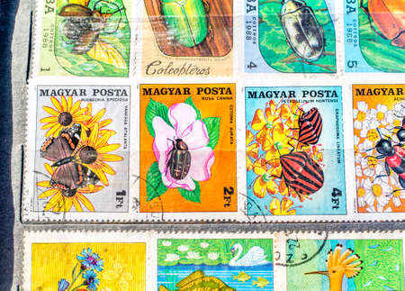 Various old postage stamps. Collectible postmarks. Old collection related to mail.